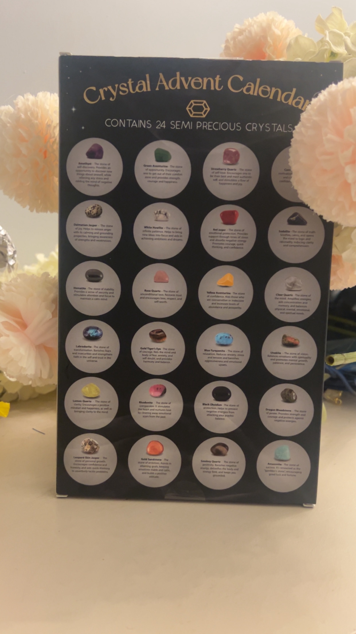 Count down the 24 days to Christmas with this mystical crystal advent calendar. Featuring 24 tumbled gemstones for spiritual healing and wellbeing, this calendar makes a special gift for the Christmas season. Stones include; amethyst, green aventurine, strawberry quartz, carnelian, dalmatian jasper, white howlite, red jasper, sodalite, hematite, rose quartz, yellow aventurine, clear quartz, labradorite, gold tiger’s eye, blue turquenite, unakite, lemon quartz, rhodonite, black obsidian, dragon bloodstone, leopard skin jasper, gold sandstone, smokey quartz and amazonite. Size, shape and colour of stones will vary, making each crystal unique.